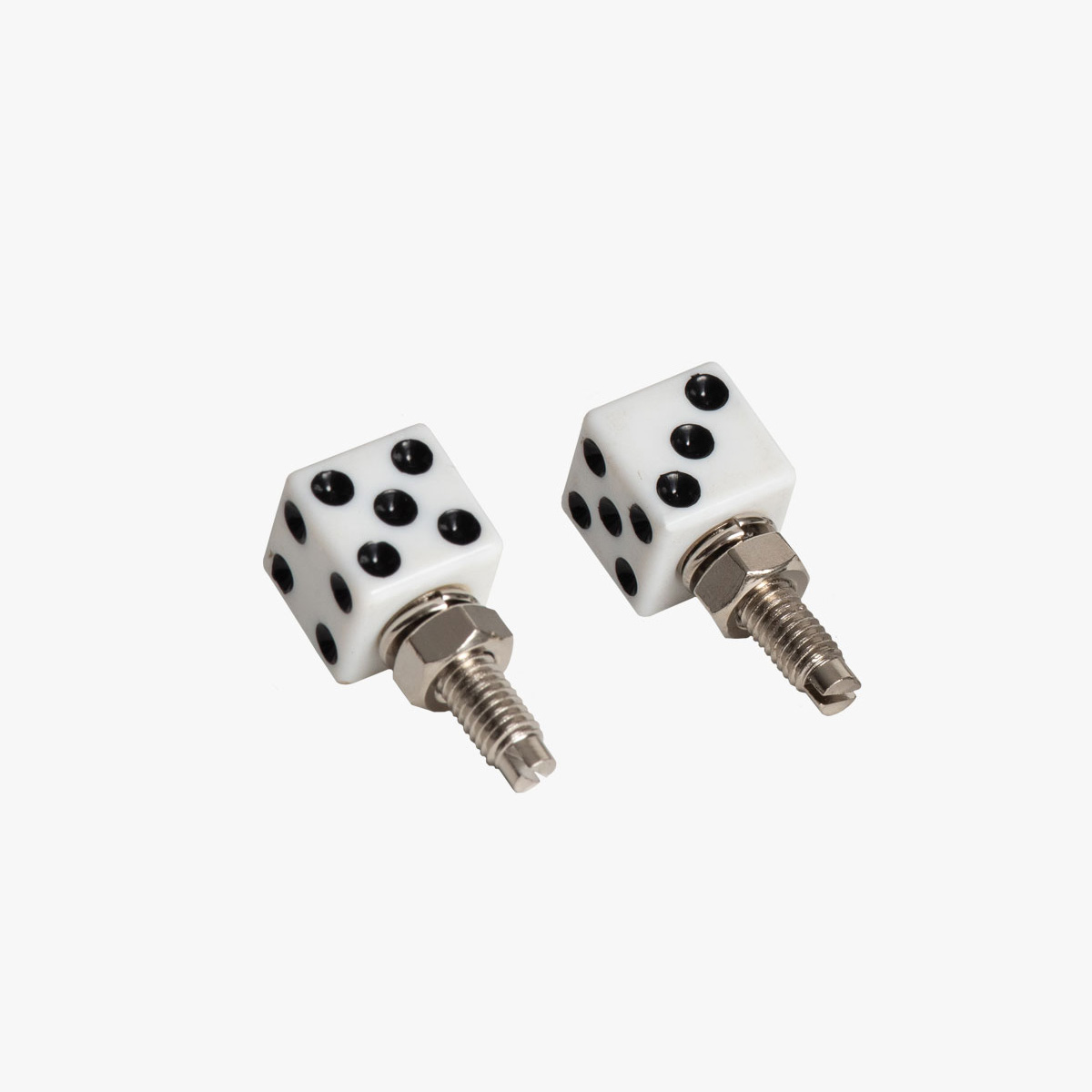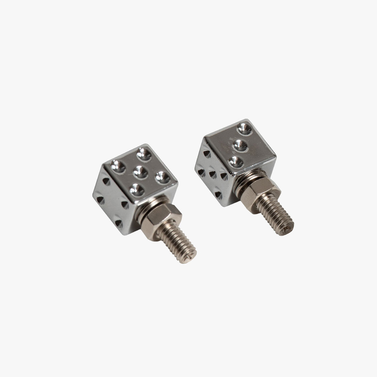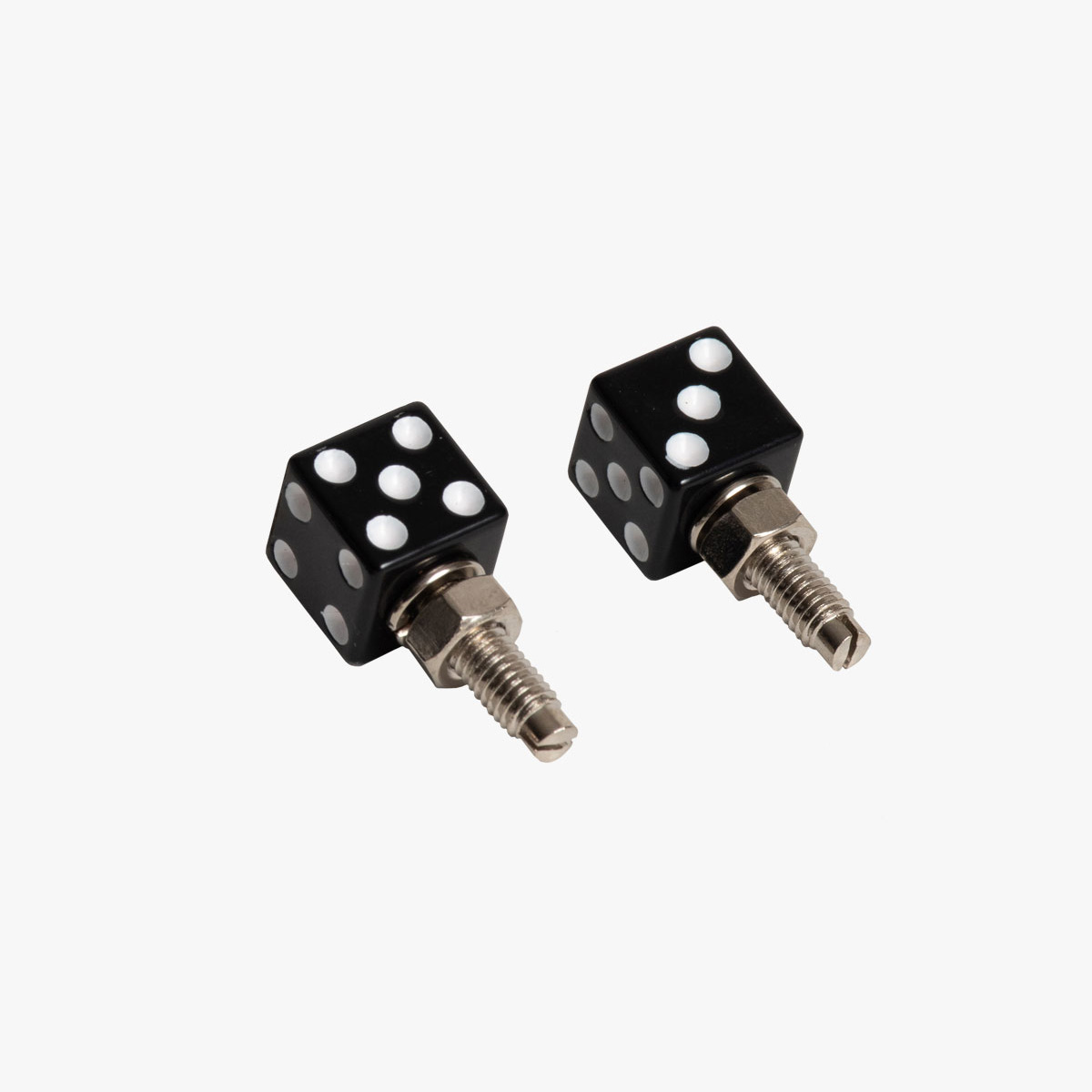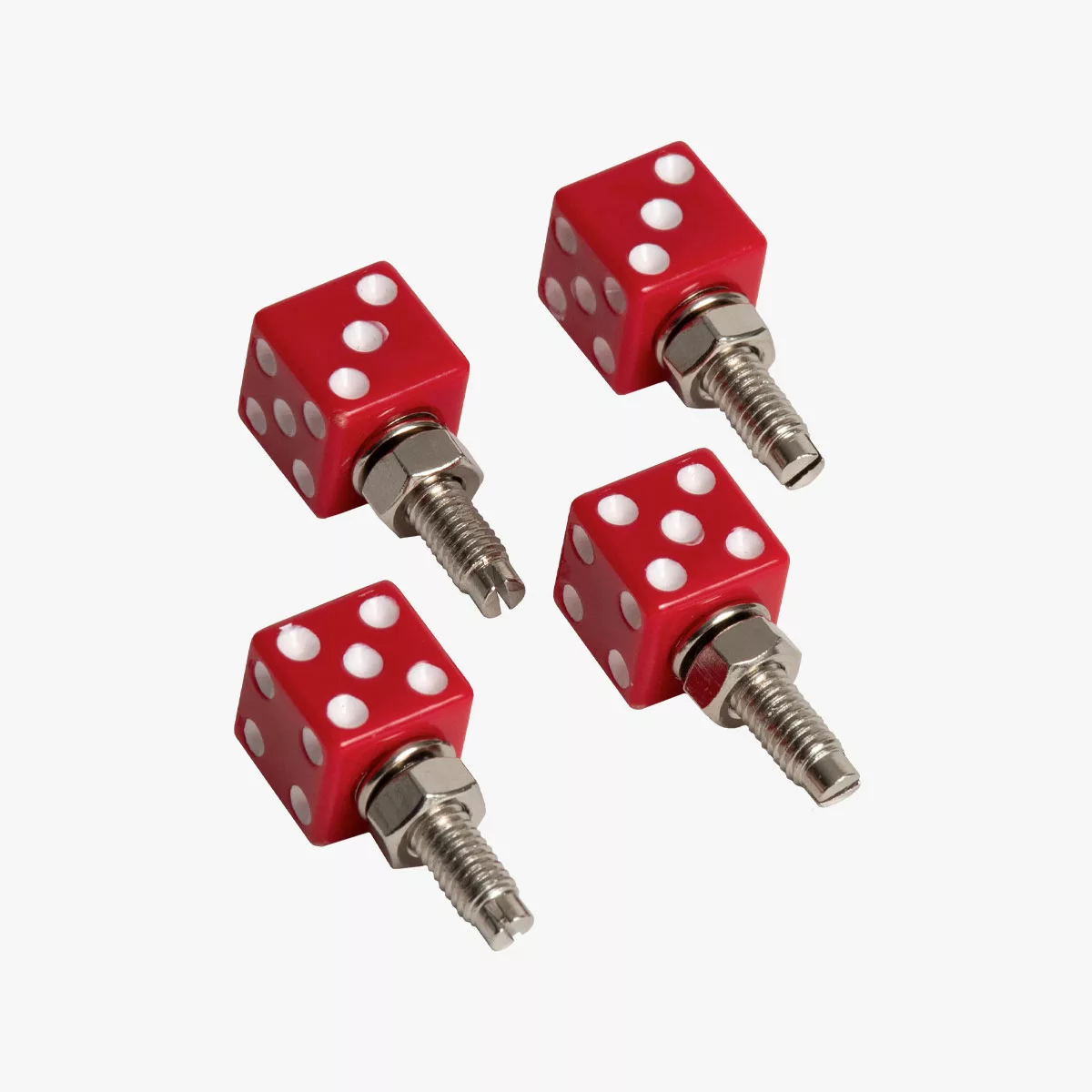 Klassiska customtärningar. Populärt nostalgitillbehör. Tärningen sitter på en gängad skruv med mutter och bricka och är därmed färdig att monteras direkt. Säljs i set om 4 nummerskyltsskruvar. Finns i flera färger.